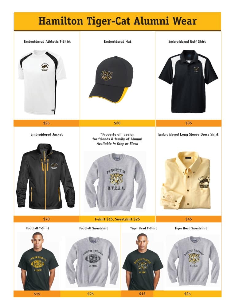 All items will also be available in the Alumni Clubhouse inside Tim Horton’s Field on game day.